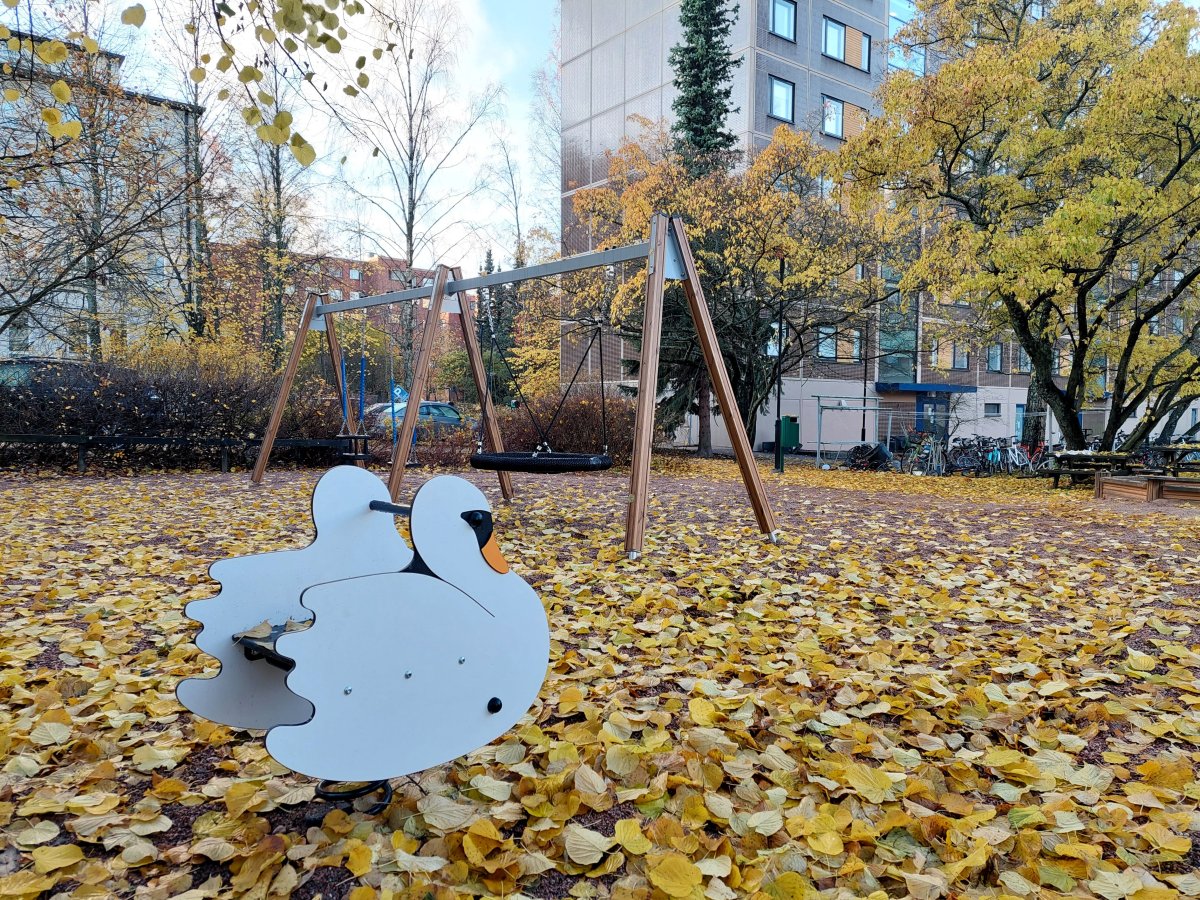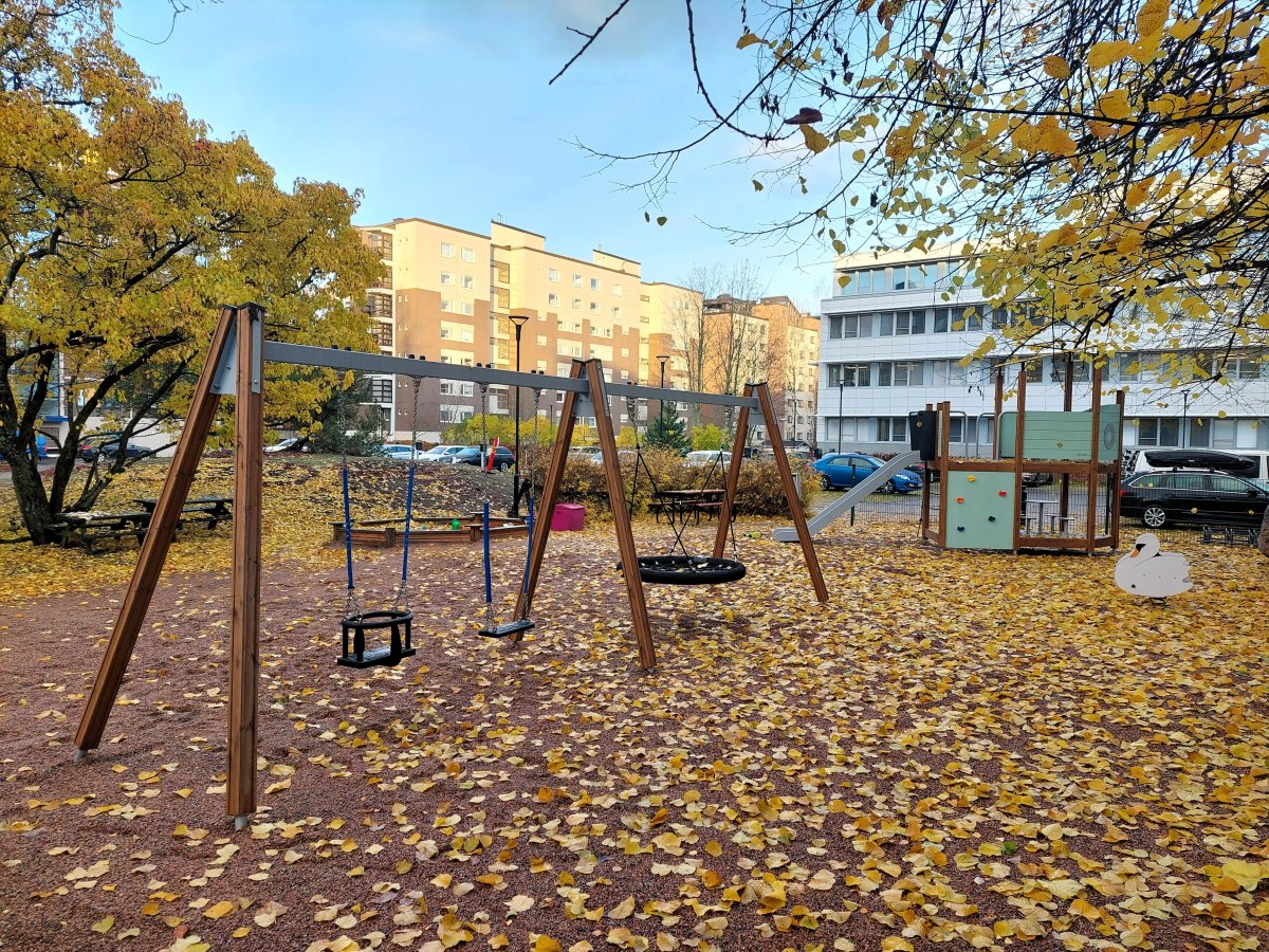 Tilavalle leikkipaikalle valittiin keinu, jossa riittää istuimia jokaiselle. Linnunpesäistuin on myös esteetön ja viihdyttää vauvasta vaariin. Joutsenjousikeinun valkoista väriä toistettiin keinun valkoisessa tehosteraidassa. Jousikeinu soveltuu korkeiden laitojensa ansiosta hyvin myös pienemmille keinujille. Grillipaikan kalusteryhmän lisäksi leikkipaikalle asennettiin oma pöytäryhmänsä, jonka ääressä valvoa lapsia tai nauttia eväitä. Siisteyttä ajatellen leikkipaikalta löytyy myös roska-astia.