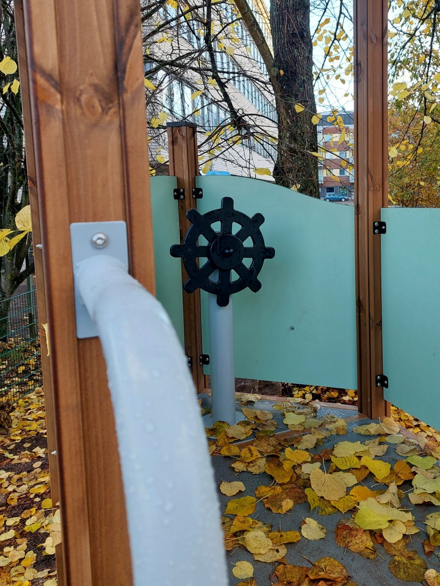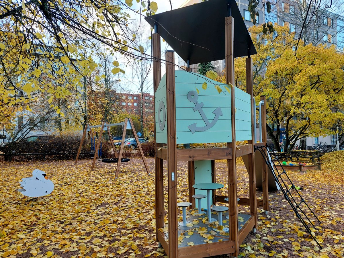 Kohde sijaitsee merellisessä Lauttasaaressa rannan tuntumassa, minkä perusteella valittiin myös teema leikkipaikalle. Kaksikerroksinen laivaleikkikeskus tarjoaa monipuolisesti leikkimahdollisuuksia kouluikäisille sekä pienemmille lapsille. Laivan alempi kansi toimii majamaisena leikkipaikana, jonne voi myös kipaista suojaan sadekuuron ajaksi. Ylemmälle kannelle voi kiivetä sekä verkkoa että kiipeilyseinää pitkin ja kapteenille on tottakai ruori laivan ohjaamista varten. Leikkeihin vauhtia tuova liukumäki suunnattiin pois tahmaavien puiden alta.