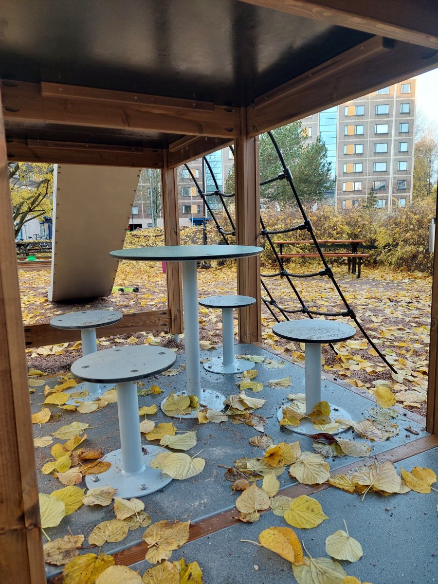 Leikkipaikan välineistä useimmat olivat jo elinkaarensa lopussa eikä kunnostamista pidetty järkevänä. Vanha hiekkalaatikko säilytettiin yhä toimivana. Hiekkalaatikko on myös helppo uusia jälkikäteen, kun väline ei vaadi suurempia perustuksia tai kaivuutöitä. Myös vanhat pöytäryhmät voidaan vielä hyödyntää eri puolilla pihaa, vaikka grillipaikalle haluttiinkin uudet kalusteet. Kalusteissa huomioitiin esteettömyys ja iäkkäämmät asukkaat valitsemalla käsinojalliset tuolit sekä pidennetty pöytä. Pöydän päähän on helppo asettua myös apuvälineitä käyttäen.