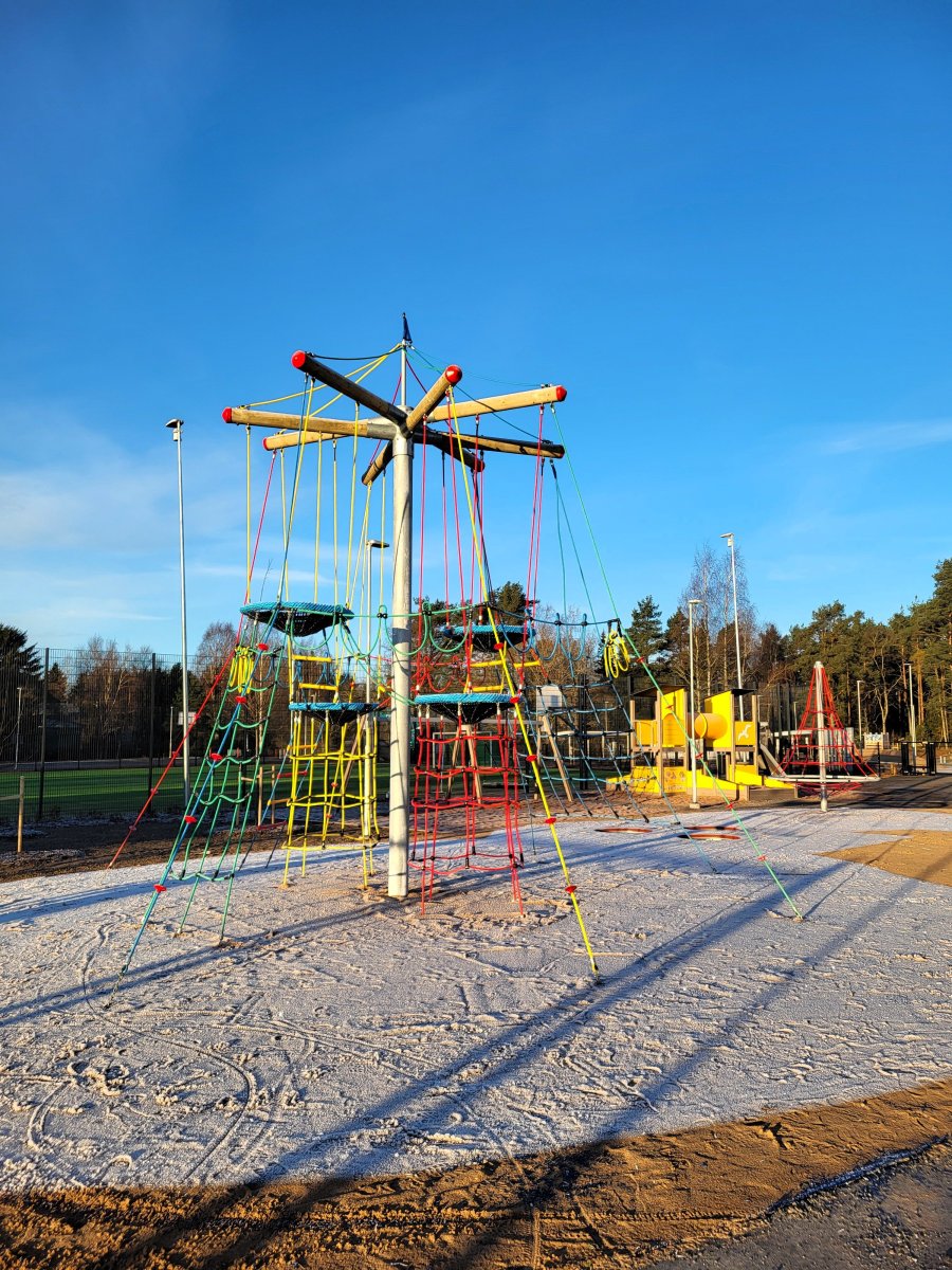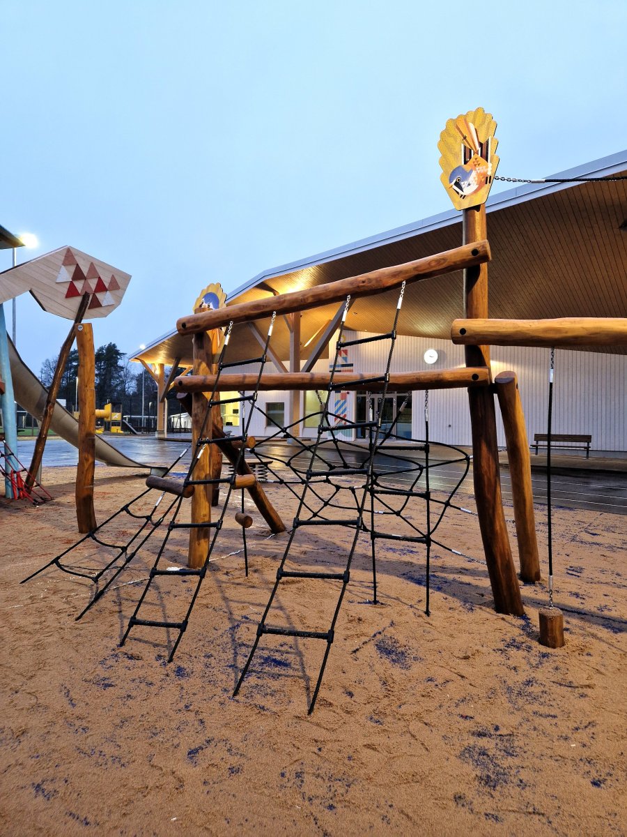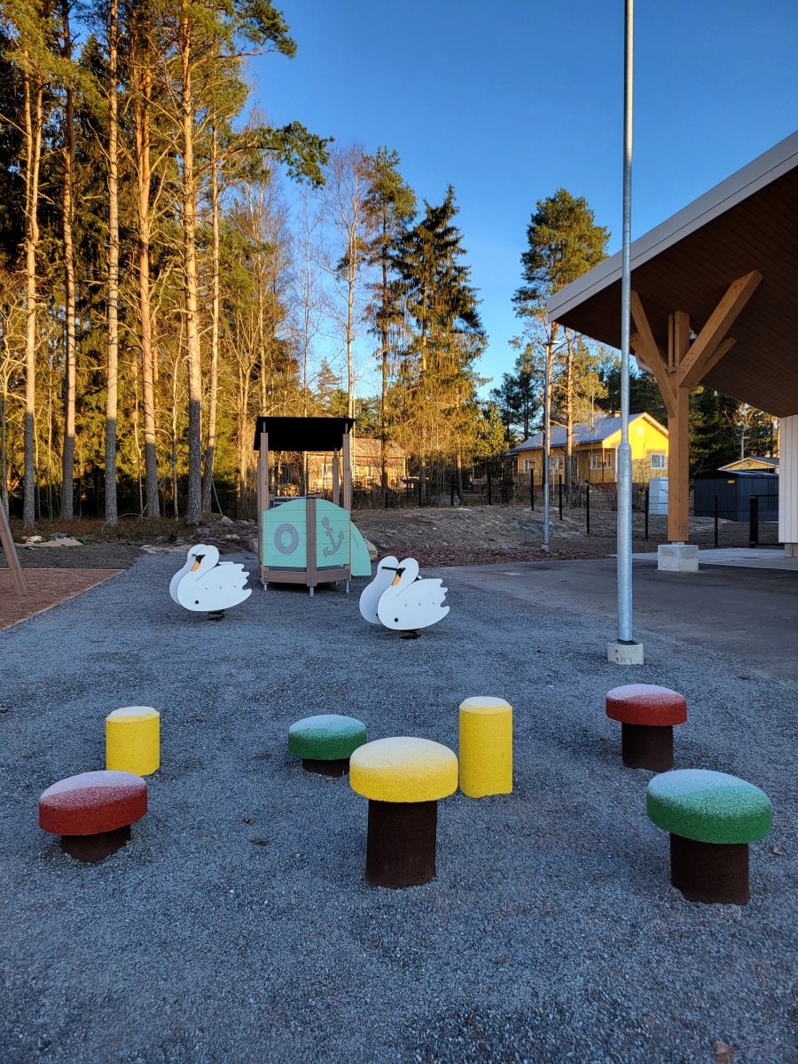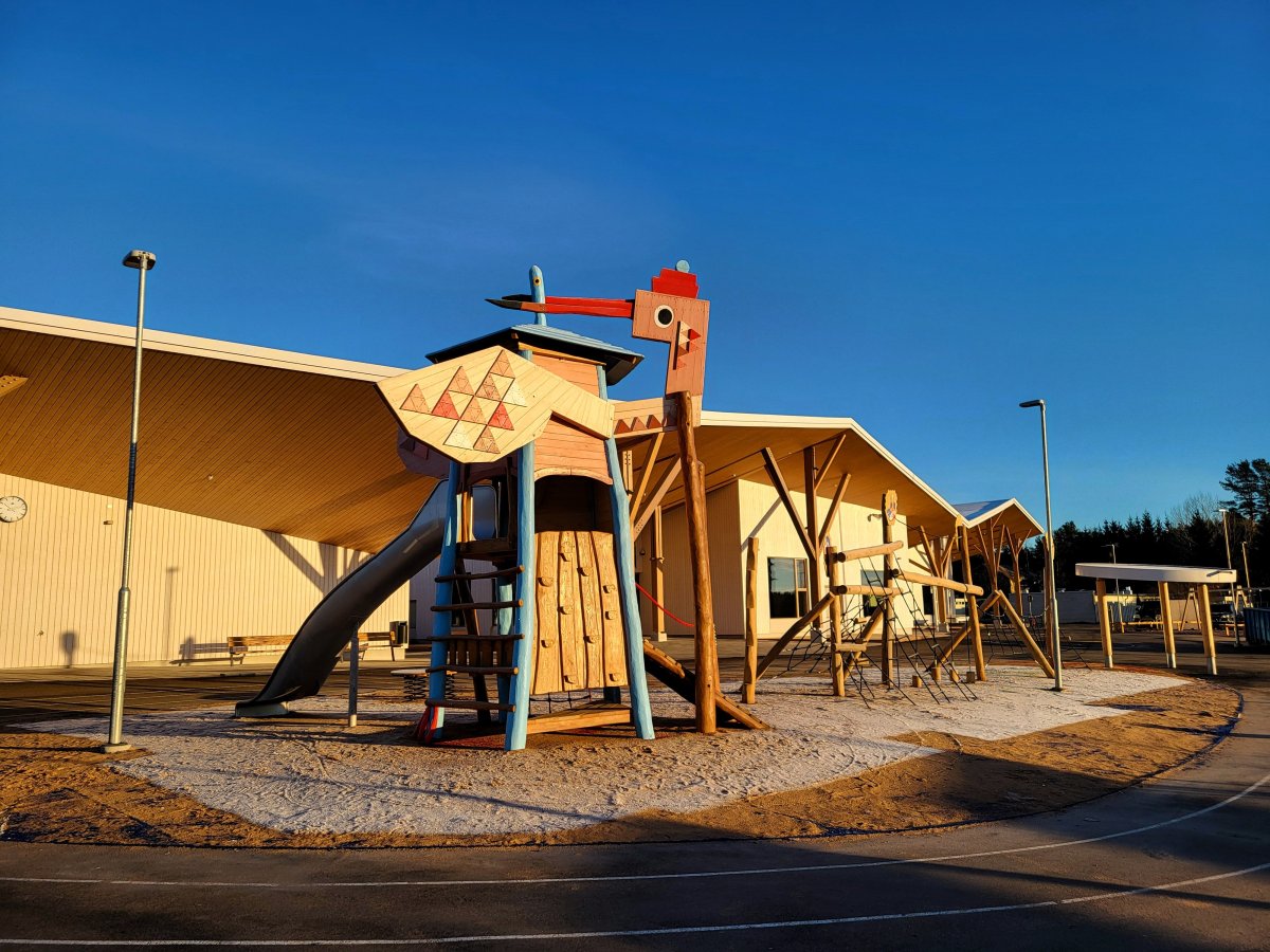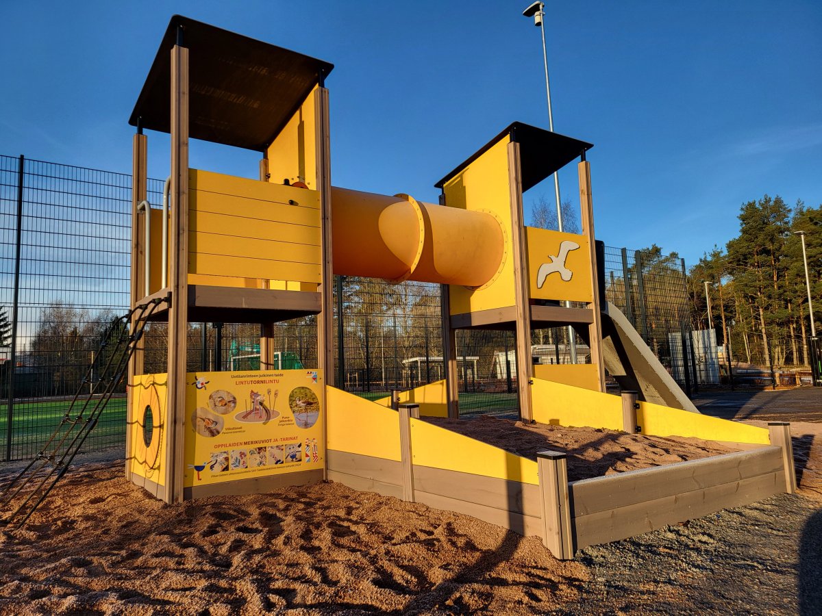 Koulun oppilaat ideoivat omissa pihan suunnittelupajoissaan pinnan ja rannan teemoihin liittyviä leikkivälineitä, pihan toiminnallisuuksian ja maamaalauksia sekä toteuttivat graafisista palikoista meriaiheisia kuvia. Koulun pihalta löytyy muun muassa lossi, purjeveneen mastoja ja katiska sekä kahlaajalintu punajalkavikloa muistuttava lintutornileikkiväline. Lintutorni on Puuhan yhteistyökumppanin Spielartin tuotantoa ja tarjoaa kiipeilyn iloa monissa kiipeilyelementeissä sekä vauhdin hurmaa pitkässä liukumäessä. Yksilöllinen juuri tähän kohteeseen suunniteltu lintutorni on näyttävä pihan keskipiste.