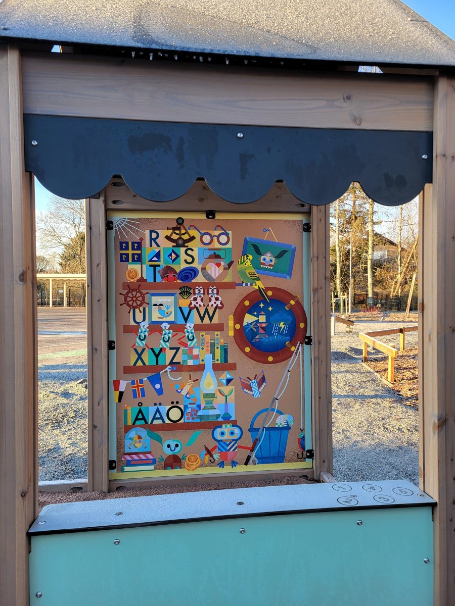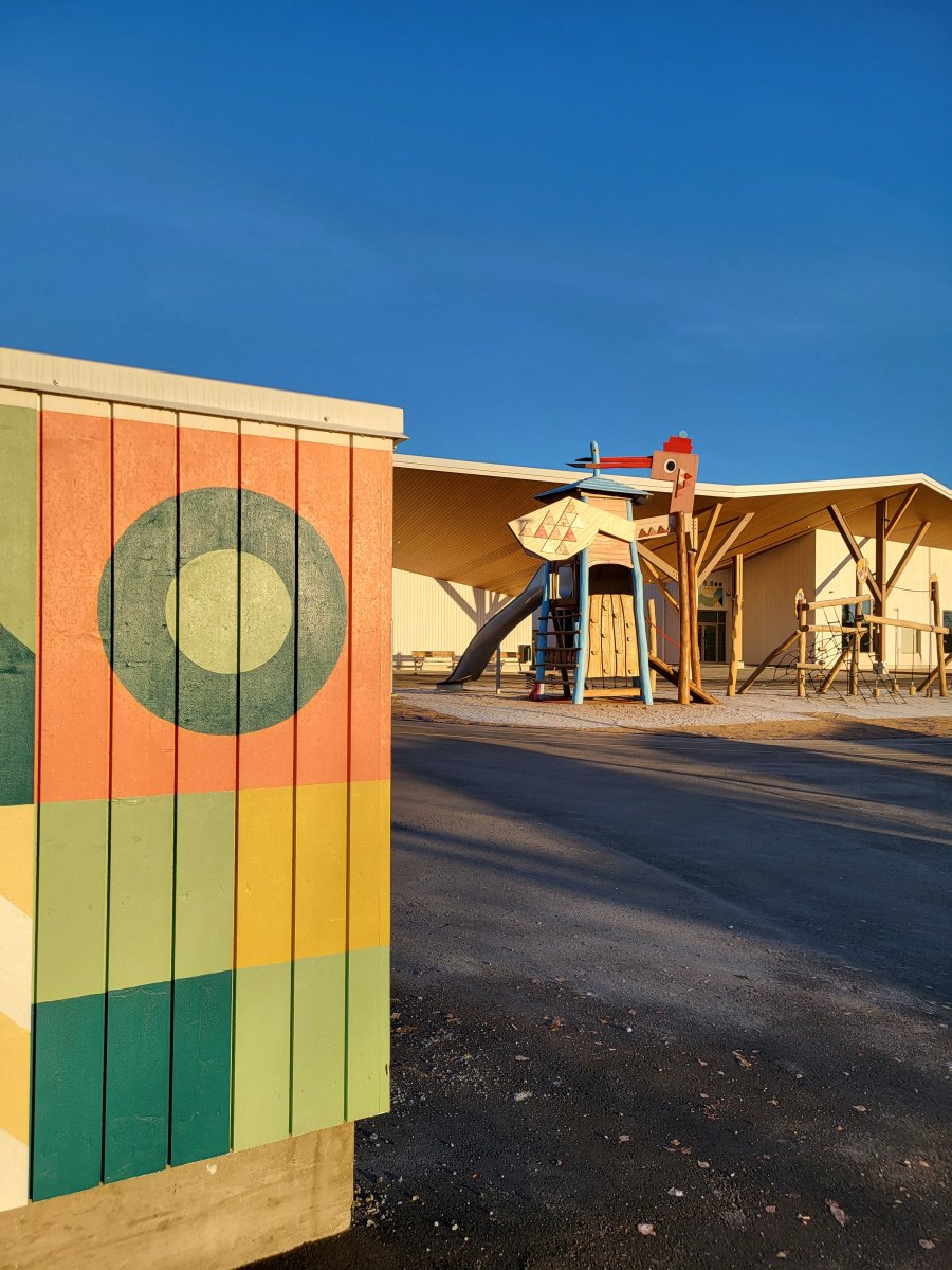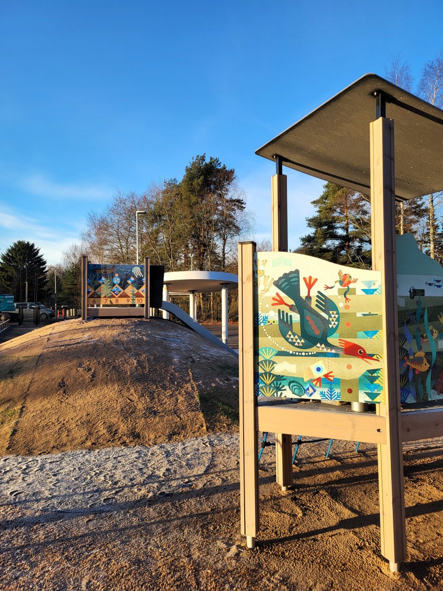UOTILANRINTEEN MONITOIMIKESKUKSEN PIHASSA NÄKYY TAIDE, JONKA LUOMISEEN OSALLISTETTIIN LAPSIA. PIHAN TAIDE RAKENTUU KOLMESTA TEEMASTA: PINNAN ALLA, PINNALLA JA RANNALLA.