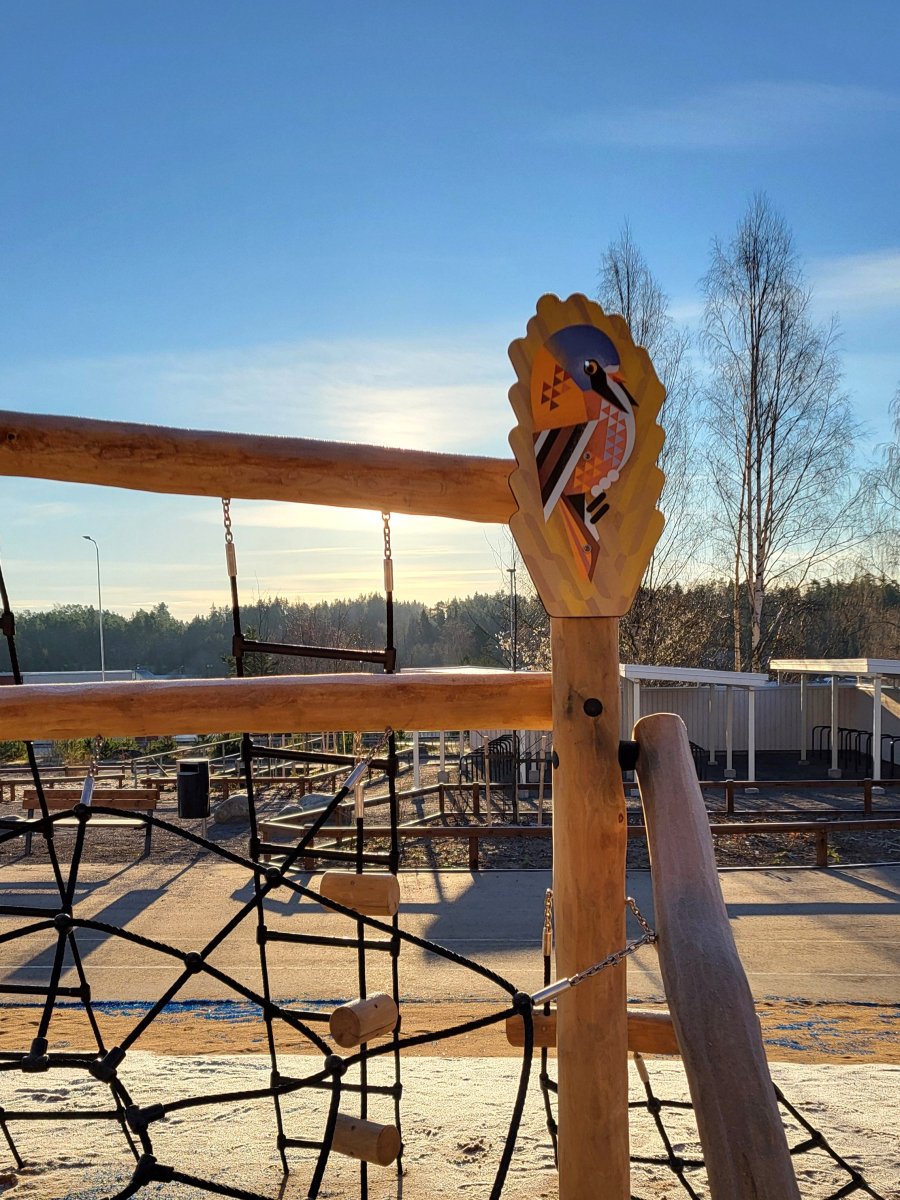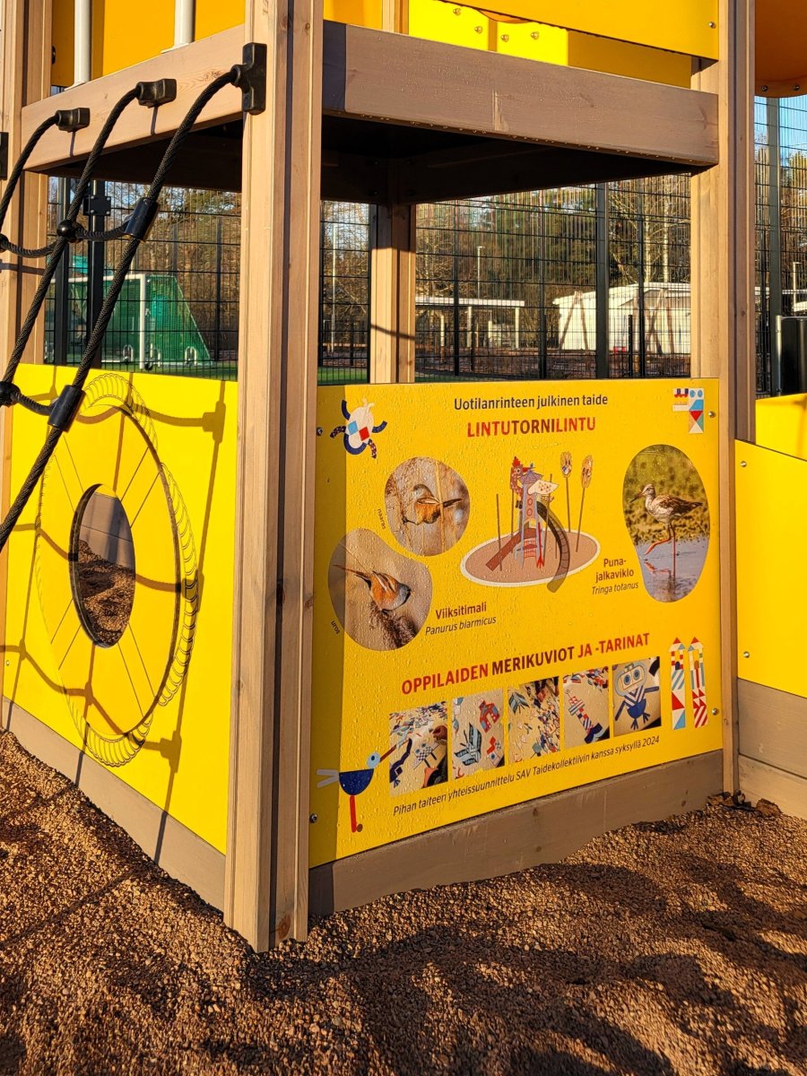 Viklon kaverina robiniapuisella kaislikkokiipeilyradalla kurkkivat myös iloiset viiksitimalilinnut. Oppilaiden tekemät kuva-aiheet ovat keskeinen osa pihan taidetta. Niitä maalattiin monitoimikeskuksen sisäänkäynteihin ja pihan melumuuriin, ja ne koristavat leikkivälineiden pintoja. Keltaisen lossin seinäpintaa hyödynnettiin myös projektin vaiheiden esittelyssä. Niin sanottuja vakiomalliston leikkivälineitä elävöitettiin ja teemoitettiin taiteen avulla pienin muokkauksin. Taide paitsi elävöittää pihaa, lisää myös mielenkiintoa ja kertoo paikallisuudesta.