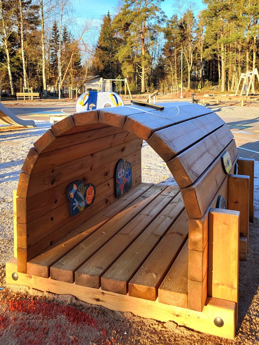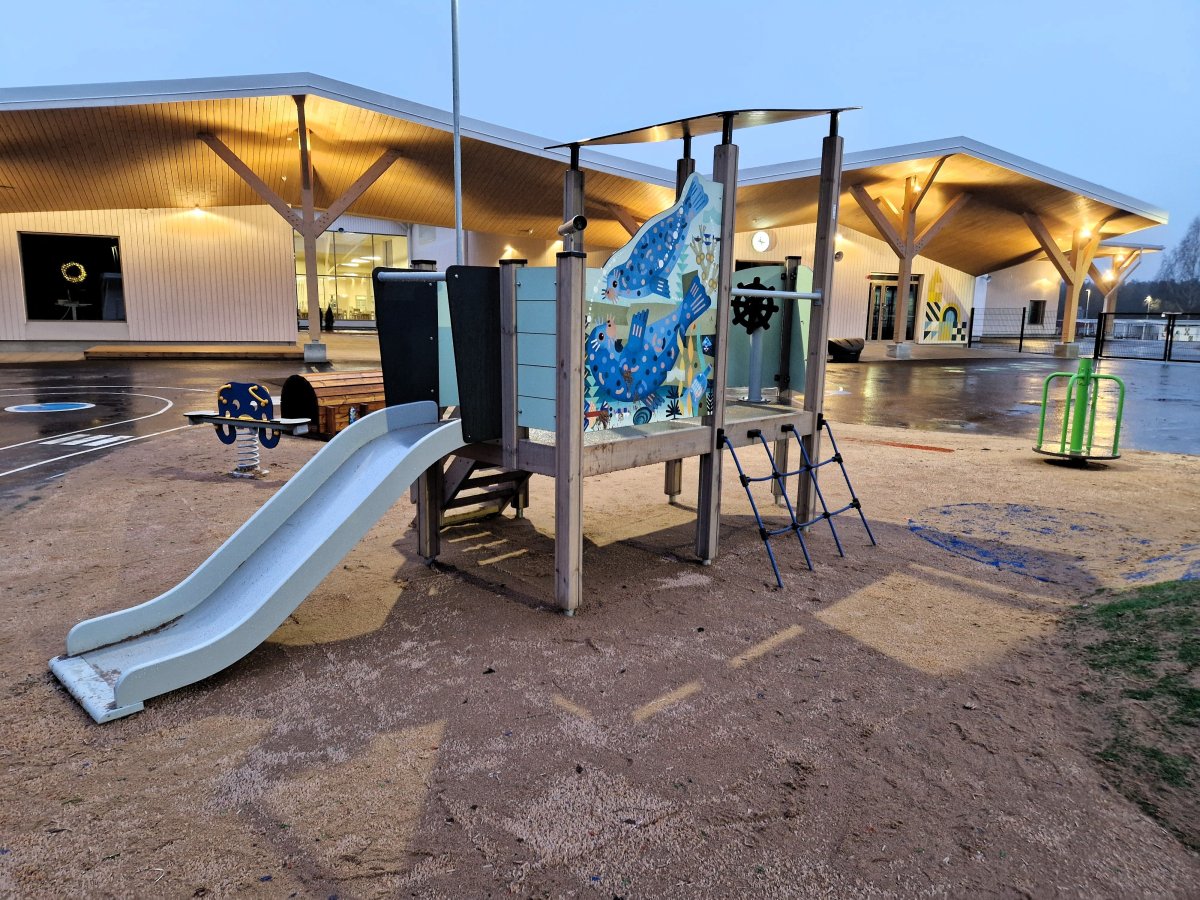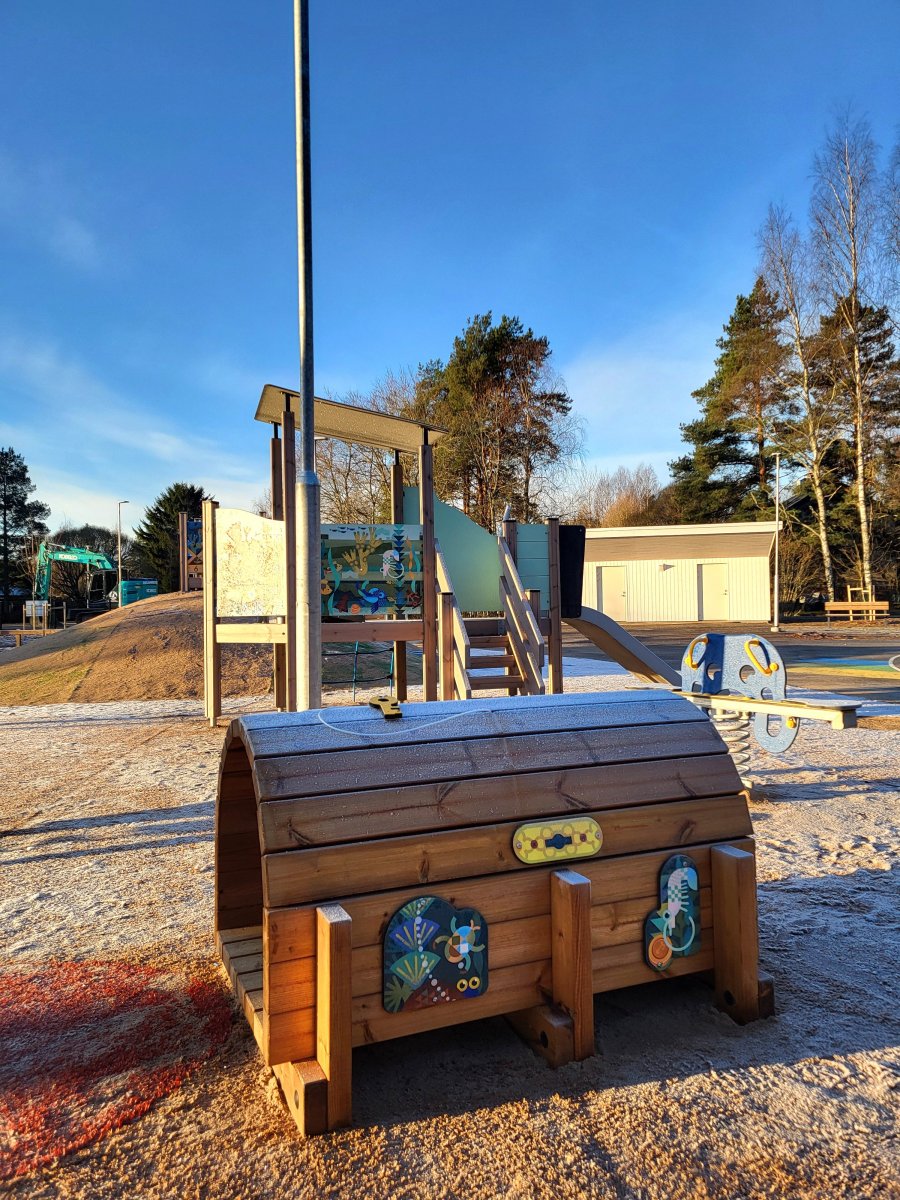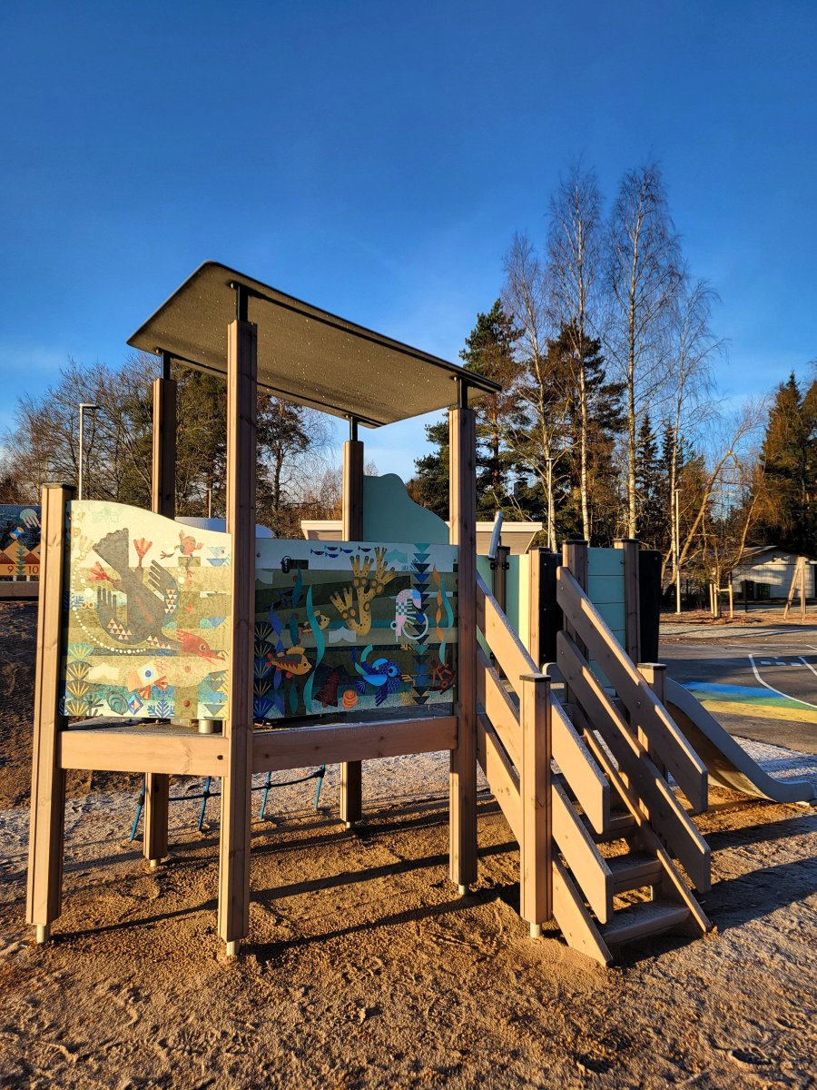 Päiväkodin pihalle rakentui merenalainen maailma, johon kuuluu muun muassa leikkikumpumerihirviö, jonka kruununa toimii liukumäki aarrekarttoineen. Lisäksi pihan leikkivälineistä löytyy mm. merieläimiä, laivan hylky ja aarrearkku sekä rantakioski. Leikkivälineiden kuvitus on toteutettu kestävällä kuvapaneloinnilla ja levyelementtien muotoleikkauksin.