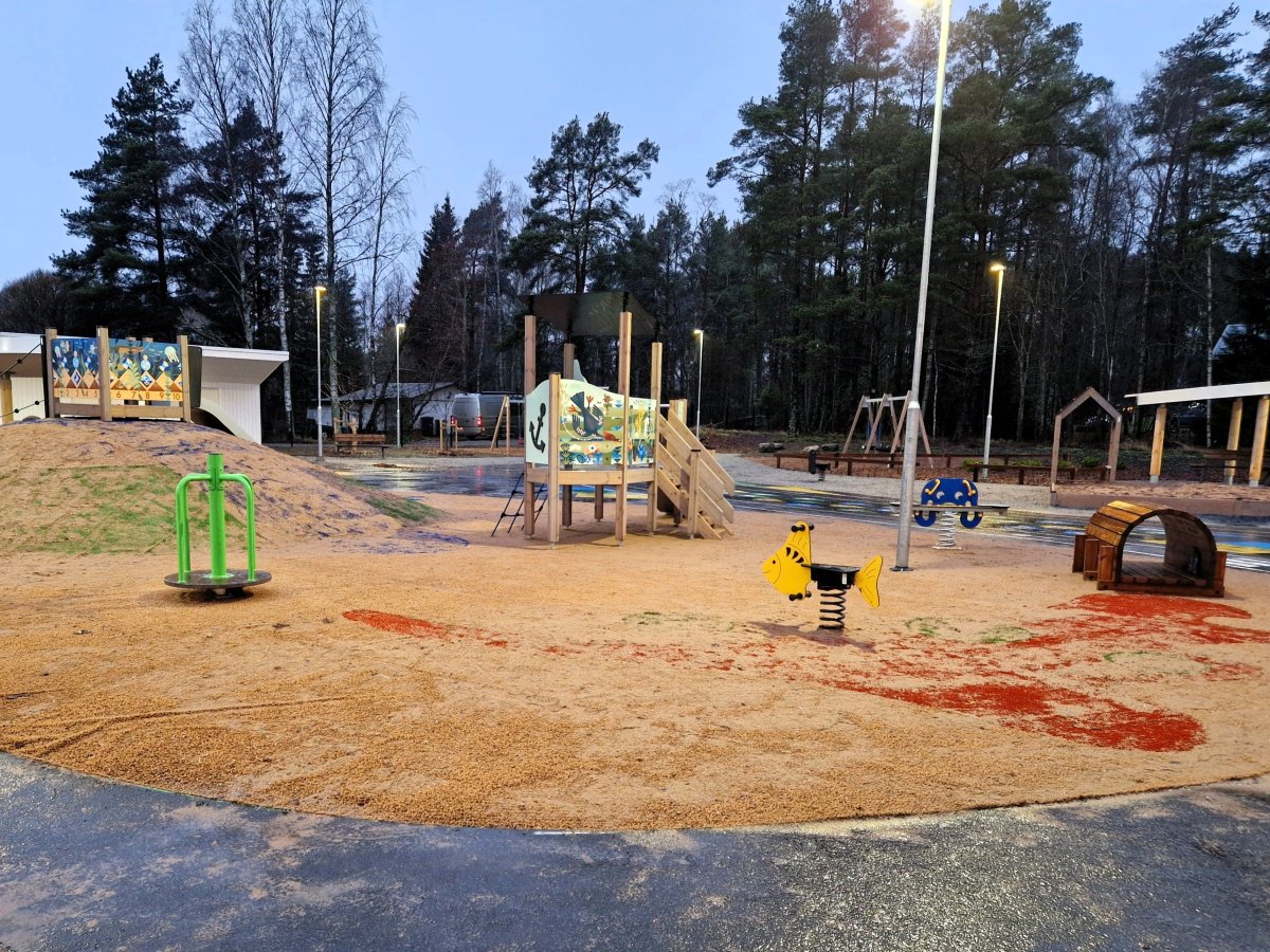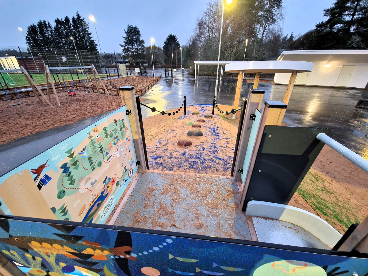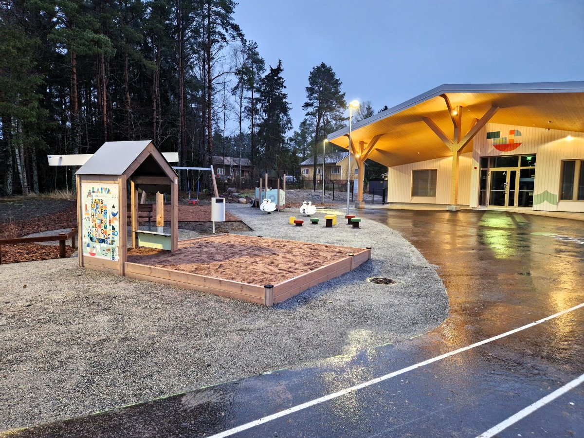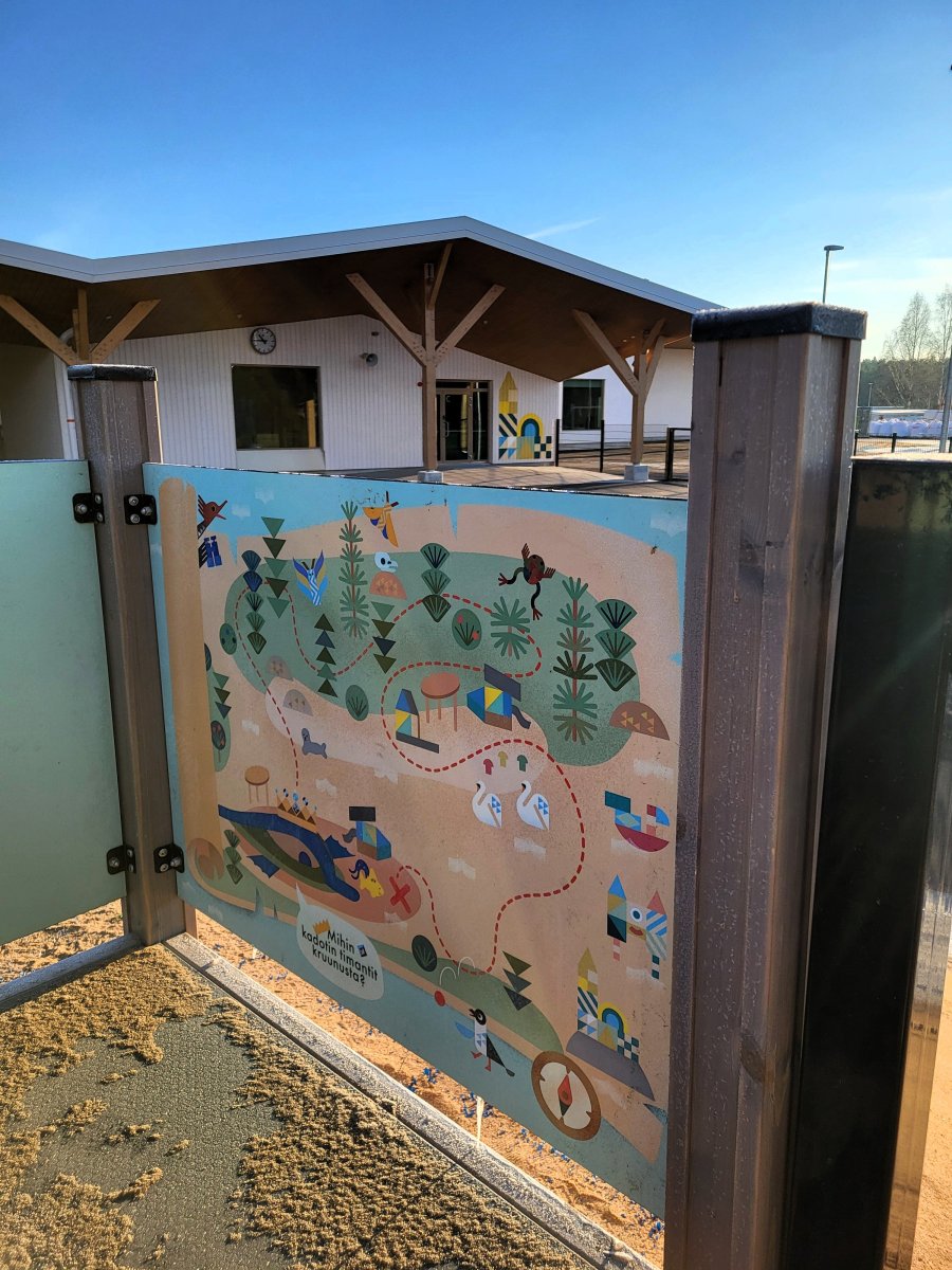 Päiväkodin pihalle rakentui merenalainen maailma, johon kuuluu muun muassa leikkikumpumerihirviö, jonka kruununa toimii liukumäki aarrekarttoineen. Lisäksi pihan leikkivälineistä löytyy mm. merieläimiä, laivan hylky ja aarrearkku sekä rantakioski. Leikkivälineiden kuvitus on toteutettu kestävällä kuvapaneloinnilla ja levyelementtien muotoleikkauksin.