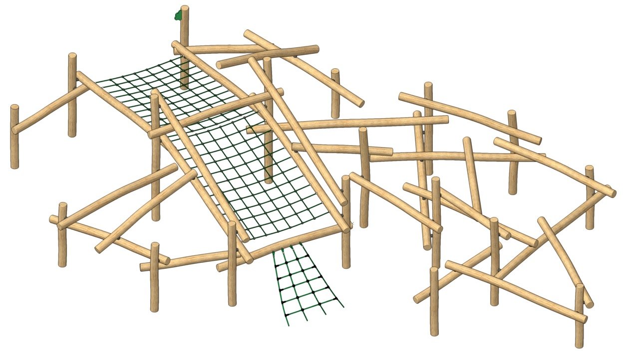 Suuri robiniapölkyllinen tasapainoilu rakennelma köysiverkolla.