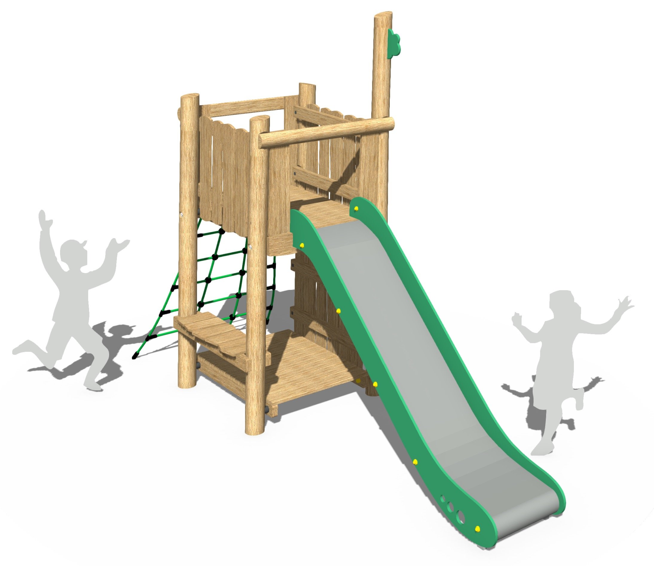 Robinia liukumäki, johon kiivetään kiipeilyverkkoa pitkin. Liukutornin alapuolella on kioskiluukku monenlaisiin leikkeihin.