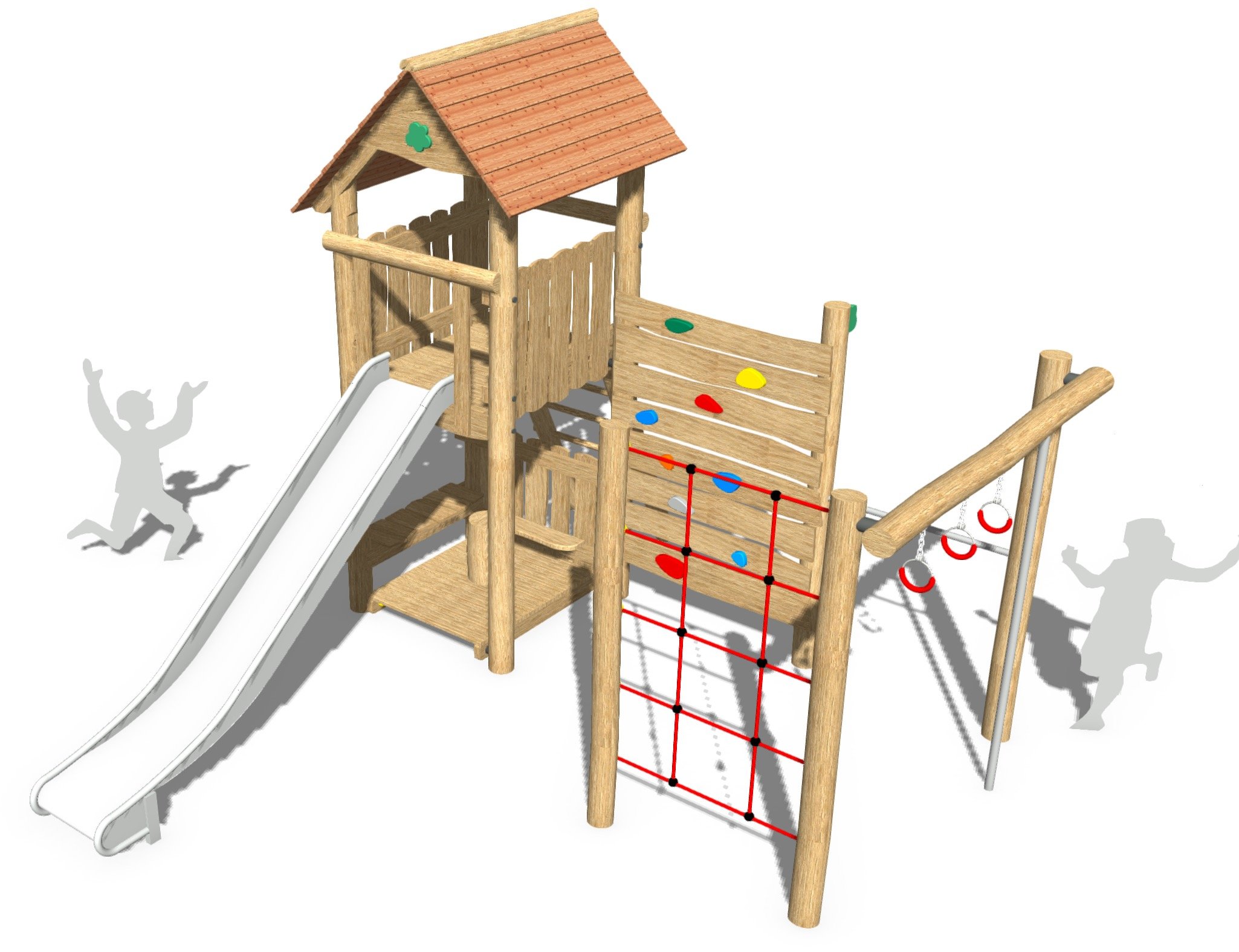 Liukumäellinen katoksellinen leikkikeskus, jonka alapuolella kioskiluukku. Leikkikeskuksessa on myös monia kiipeilyelementtejä kuten kiipeilyverkko ja roikkumisrenkaat.
