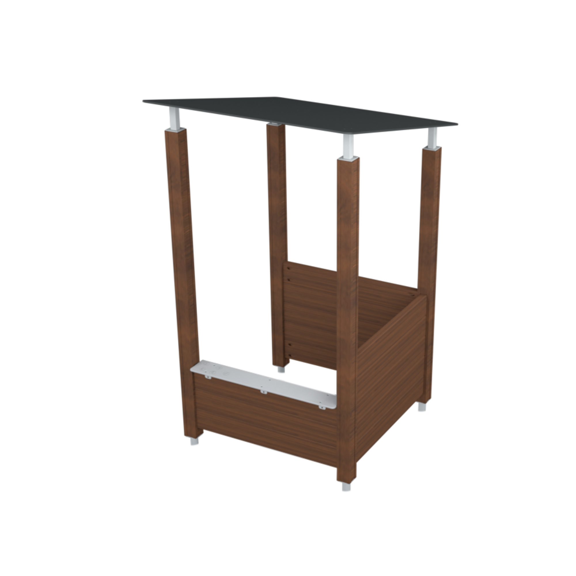 Puinen leikkikatos suojaa sateelta ja auringolta. Madallettu seinämä houkuttelee niin kauppa- kuin kioskileikkeihin.