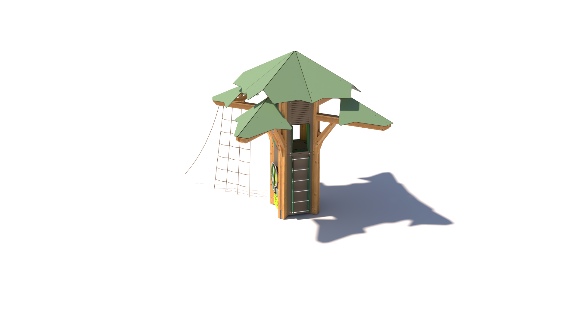 Puun muotoinen leikkikeskus kiipeilyverkolla ja toimintopaneeleilla. Seinäpaneelit muokattavissa eri toiminnoilla, mahdollistaen kaikenikäisten liikkumisen ja leikkimisen.
