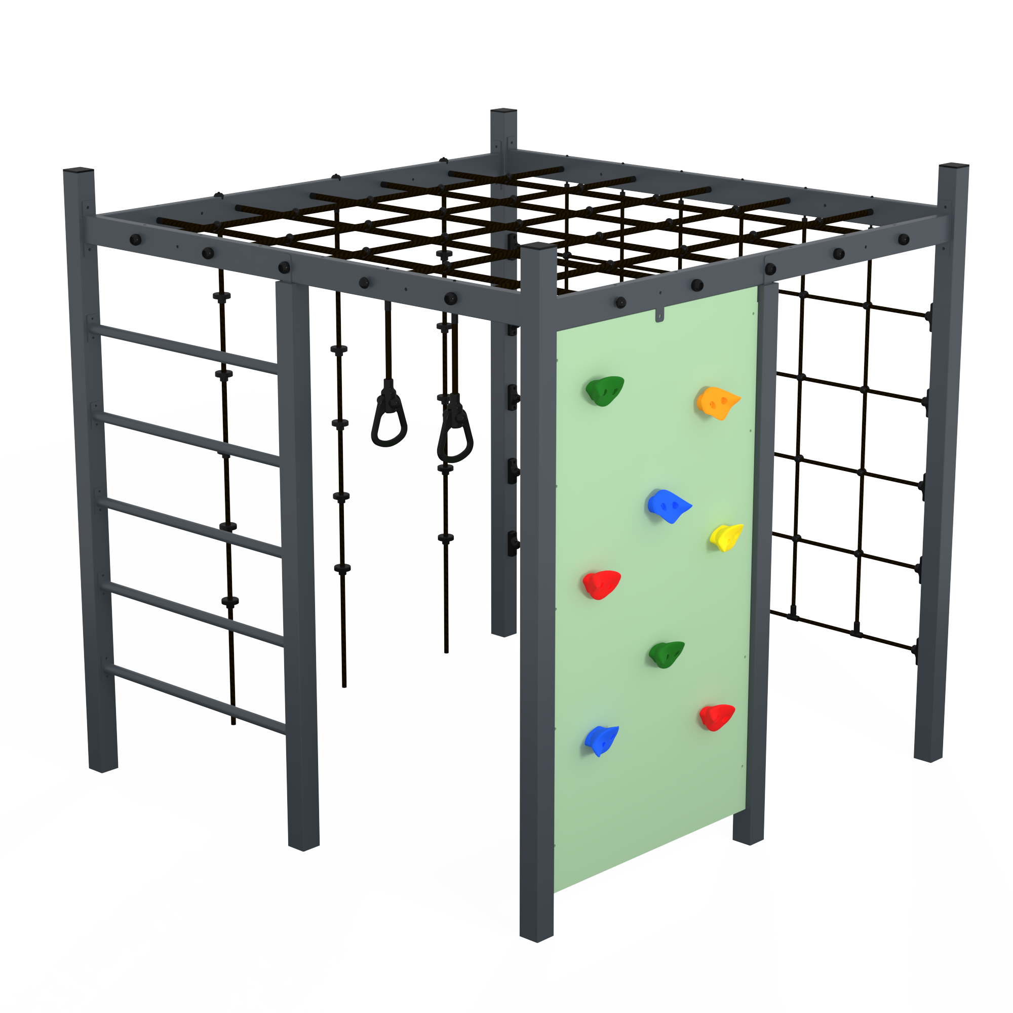 Monipuolinen metallinen kiipeilyteline verkoilla, kiipeilyseinällä, puolapuilla ja roikkumisrenkailla.