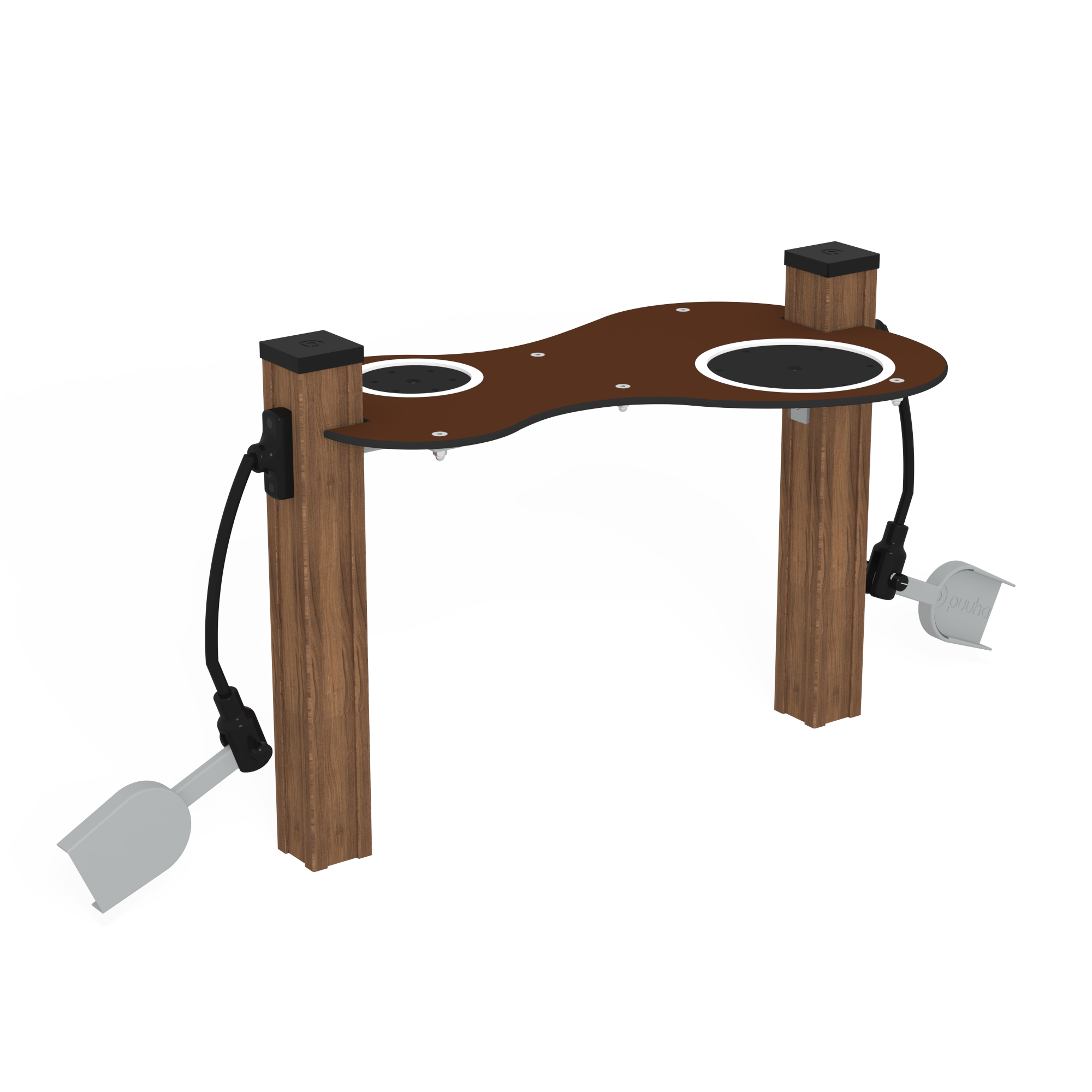 Hiekkalaatikkoon tai hiekkalaatikon läheisyyteen soveltuva hiekkaleikkipöytä, jossa kaksi hiekkasihtiä ja lapiota kiinnitettynä puutolppiin.