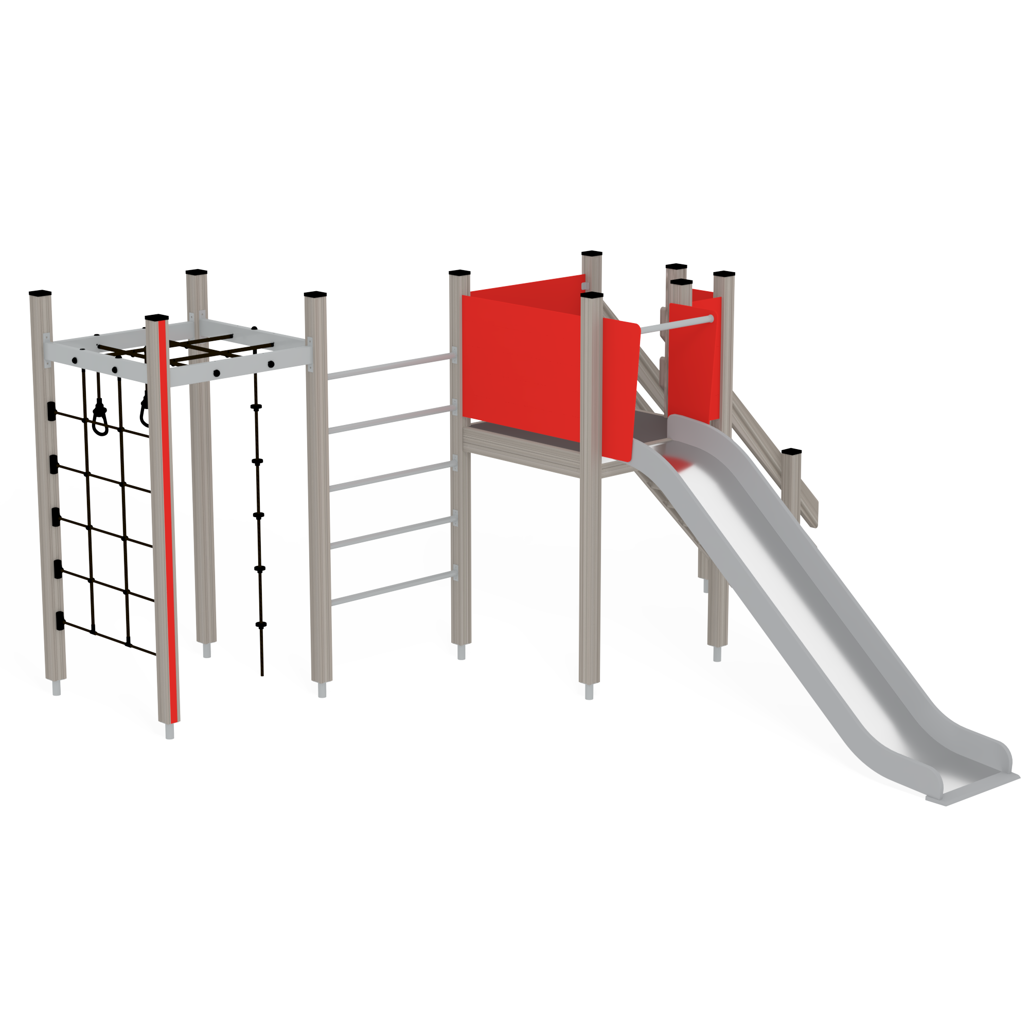 Useita eri kiipeilymahdollisuuksia ja liukumäen sisältävä leikkikeskus. Liukumäkeen kiivetään portaita pitkin, kaiteissa useita otemahdollisuuksia eri korkeuksilla. Roikkumisrenkaat lisäävät hauskuutta!