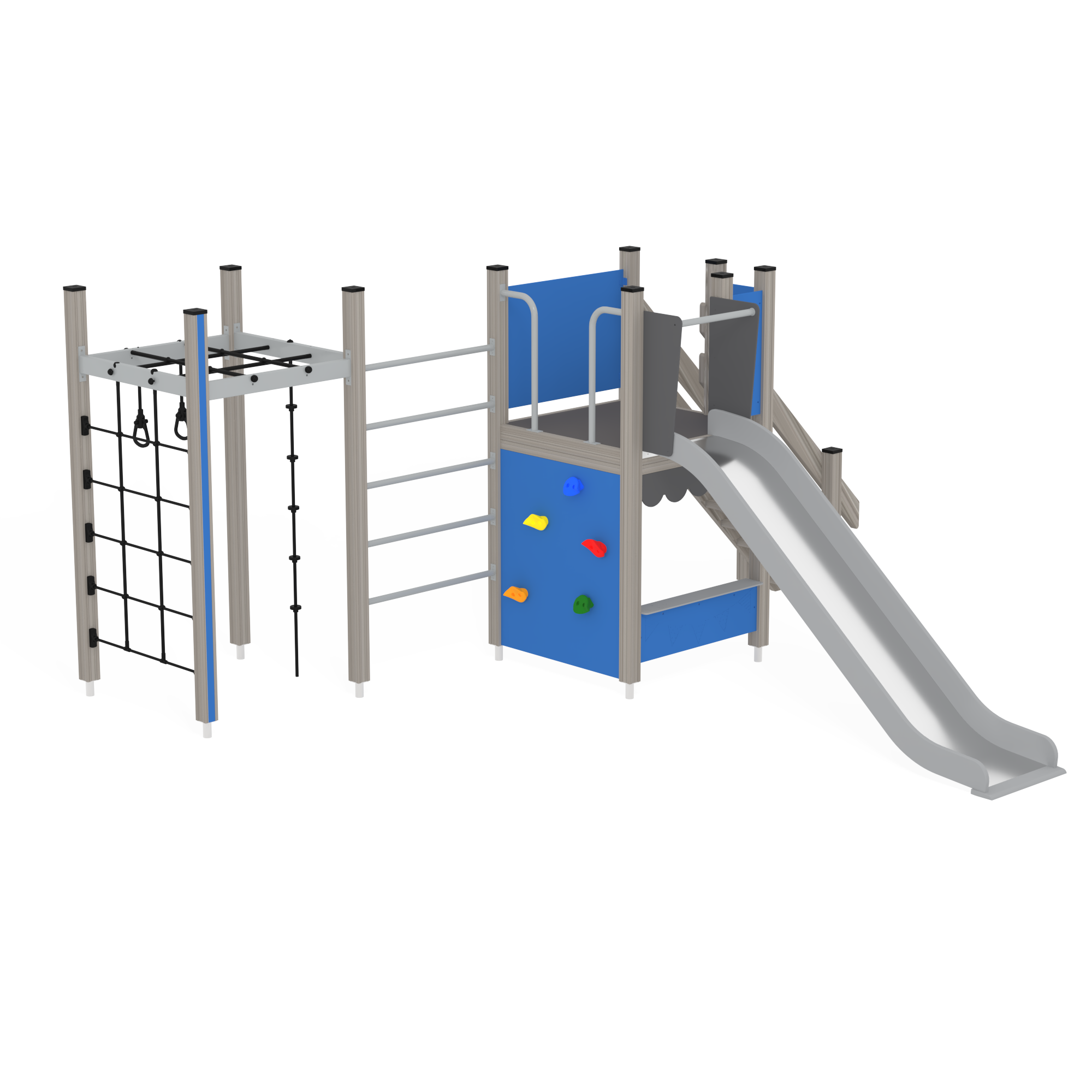 Useita kiipeilymahdollisuuksia ja liukumäen sisältävä leikkikeskus. Liukumäkeen voi kiivetä kiipeilyseinää tai portaita pitkin. Liukumäkitornin alla myös kioskiluukku leikkejä varten.