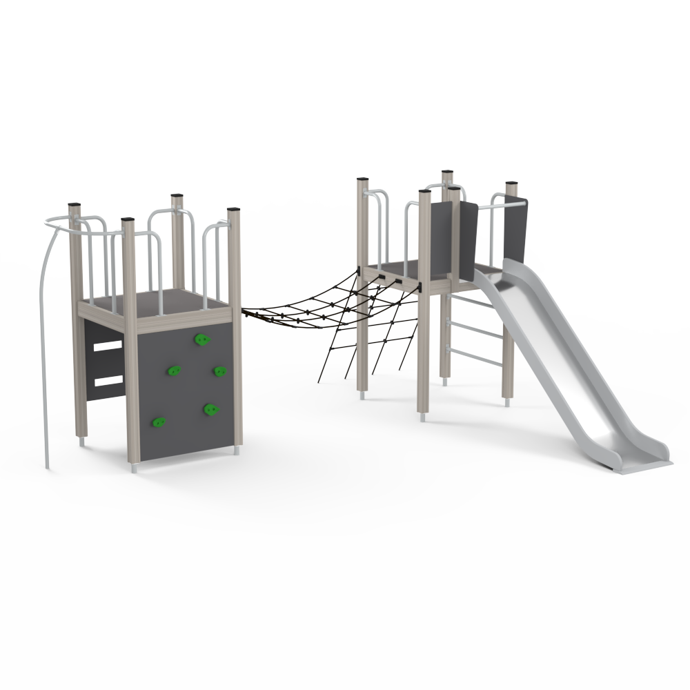 Monenikäisille lapsille soveltuva leikkikeskus useilla erilaisilla kiipeilymahdollisuuksilla ja liukumäellä.