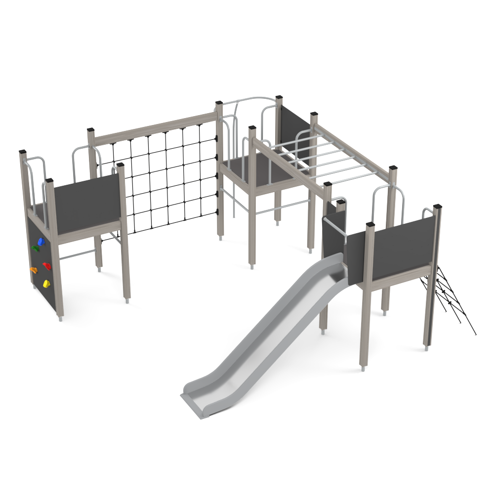 Kolmen tornin leikkikeskus monen ikäisen lapsen yhteiseen hauskanpitoon. Taitavimmat voivat suorittaa toiminnot ratatyyppisesti laskien lopuksi vauhdikkaasti liukumäkeä alas. Yksittäisinä toimintoina leikkikeskus sisältää mm. kiipeilyseinän ja -verkkoja sekä apinapuut, joilla voi temppuilla roikkuen tai päällä kiipeillen.
