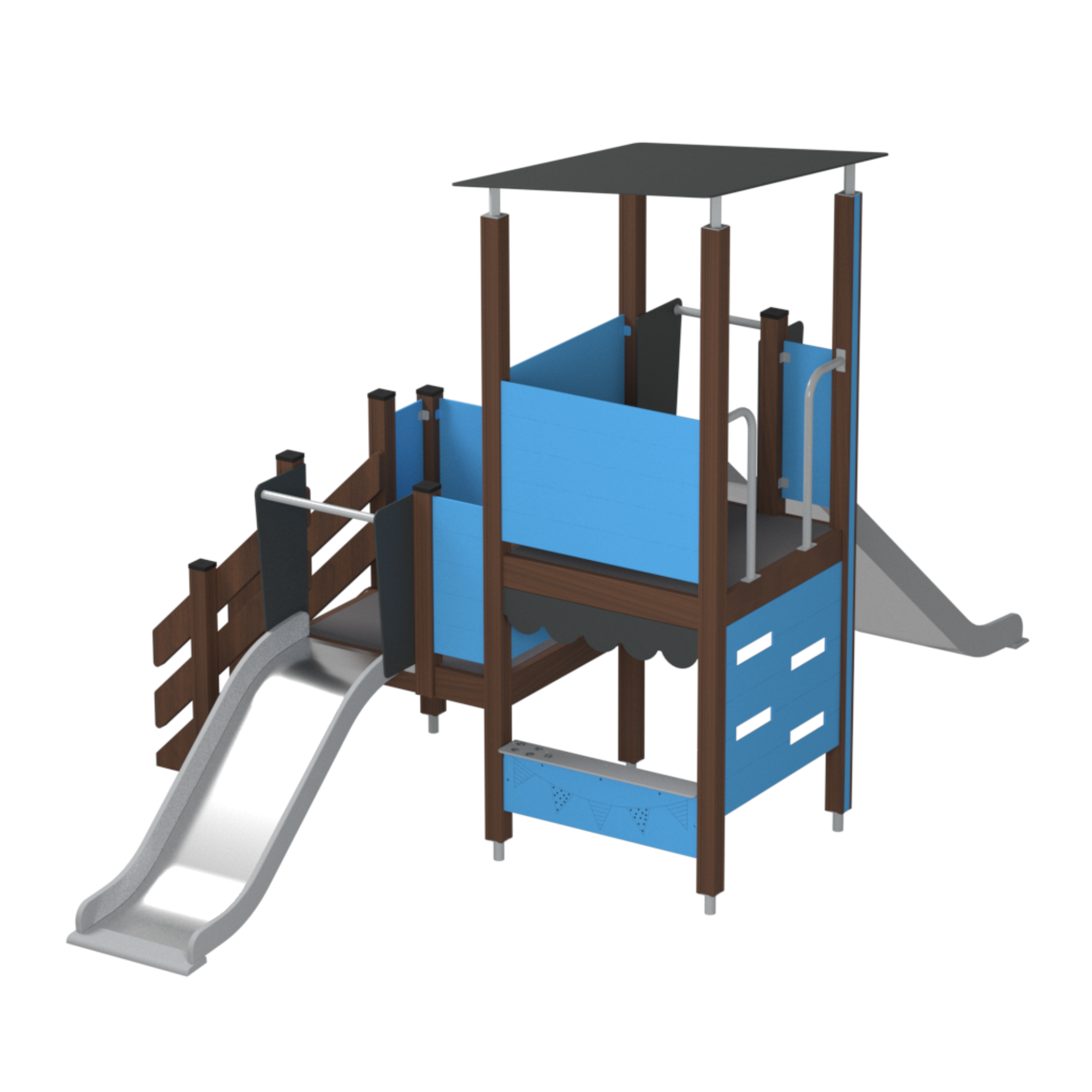 Kompakti kahden liukumäen leikkikeskus. Matalammassa osiossa pienempienkin lasten on turvallista leikkiä ja isommat puolestaan viihtyvät torniin kiipeillen ja sieltä alas laskien. Tornin alle jää hauska kioskiluukun kera varustettu leikkipaikka monenlaisiin puuhiin.