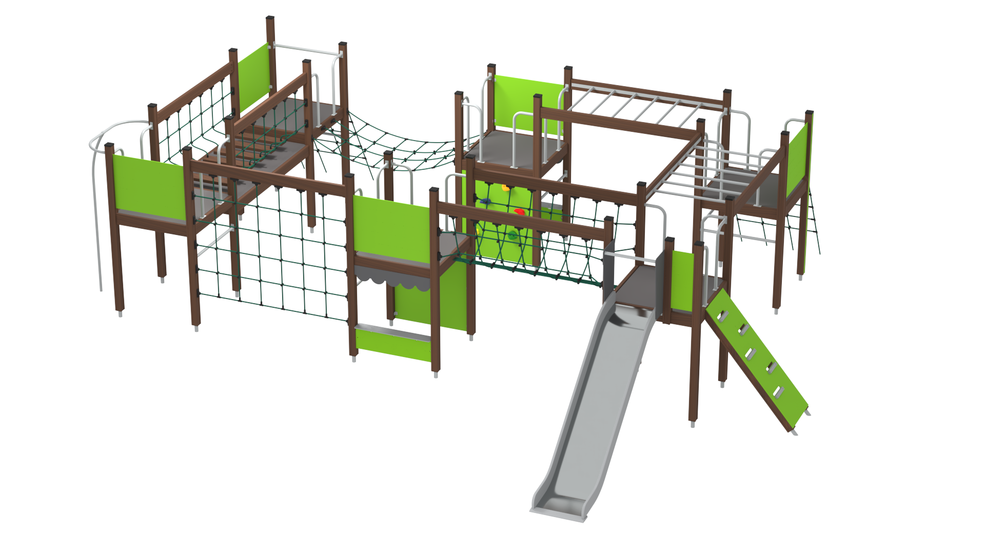 Suuri kuusitorninen leikkikeskus monilla erilaisilla toiminnoilla, jotka voi kiertää myös ratamaisesti. Nousuvaihtoehtoina verkkoja, kiipeilyseiniä ja tankoja. Riippusilta ja heiluvien askelmien silta kehittävät tasapainoa ja ketteryyttä, apinapuilla puolestaan voi kokeilla voimiaan roikkumalla edeten tai rohkeimmat niiden päällä kiipeillen. Palomiestanko sekä liukumäki tarjoaa vauhdikkaimmat reitit alas. Moduulirakenteen ansiosta toimintojen paikkoja on mahdollista vaihtaa vaivattomasti.