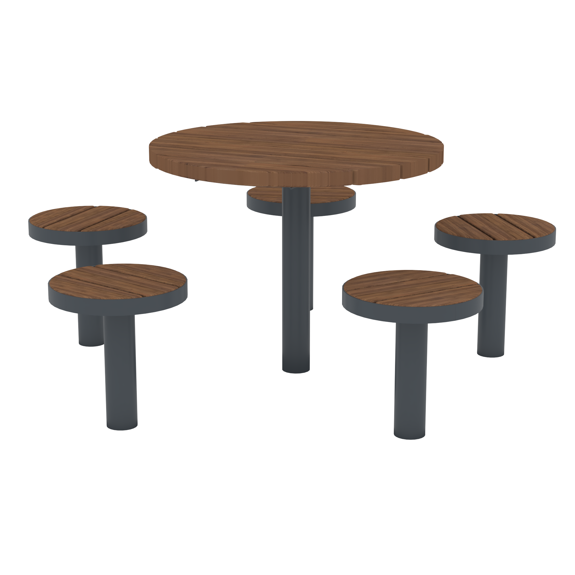 Pyöreä kalusteryhmä sisältäen 5 jakkaraa ja pöydän.